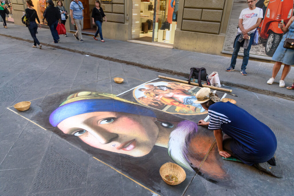 In Florence, be careful where you walk in crowded squares. Scammers place cheap paintings on the pavement. They put them where you are likely to step on them. If you do, they will accuse you of damaging their art. They will then demand you pay for the “ruined” piece.