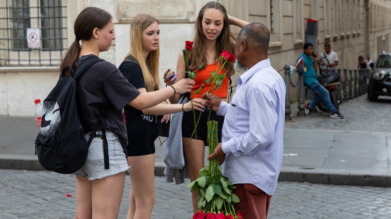 How to avoid it: Do not engage with them at all. Avoid eye contact and keep walking. A firm “No, grazie” works. If they put a bracelet on you, take it off, drop it, and walk away.
