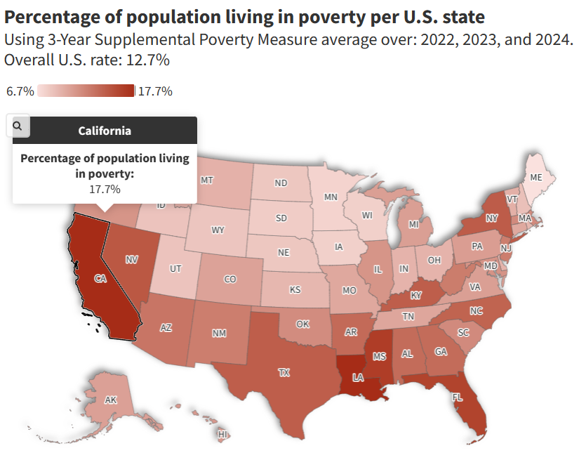 It might be surprising to see a state like California, home to Silicon Valley and Hollywood, at the top of the poverty list. But when we look through the lens of the Supplemental Poverty Measure (SPM), the reason becomes clear: even a decent income doesn’t go far when basic living costs are sky-high.