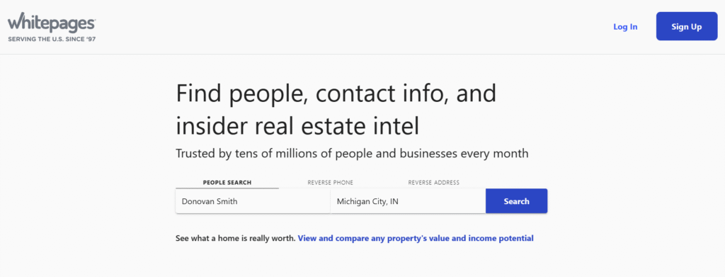 Head over to Whitepages.com. In the search bar, type in your full name along with your city and state. Click “Search.”