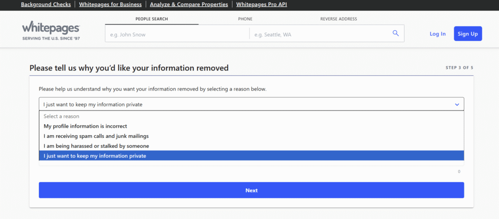 Next, you’ll be asked why you want your info removed. You’ll get a few options like: